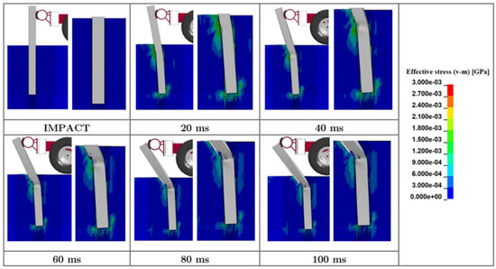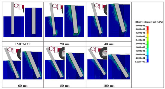In contrast to the “long” or “flexible” pile, i.e., W152 × 12.6 with an embedment of 1016 mm, the behavior of the W152 × 23.6 pile with an embedment of 1016 mm is primarily governed by lateral soil failure instead of the yielding of the pile, as presented in the time-sequential photographs of the physical impact tests and simulated in Figure 8. The lateral impact load caused the failure of the granular (MASH strong) soil along the entire pile length, as depicted in the effective (von Mises) stress contours in Figure 9. Therefore, a 152 × 23.6 pile with an embedment of 1016 mm behaves essentially as a “short” or “rigid” pile, and the dynamic soil resistance governs its impact behavior, load capacity, and energy dissipation.
