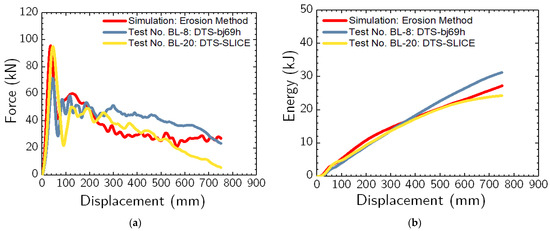 Comparison of: (a) force vs. displacement and (b) energy vs. displacement plots from simulation using erosion method and physical impact tests (i.e., test nos. BL-8 and BL-20).