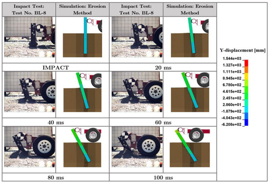 Time-sequential images of dynamic impact test (test no. BL-8) and simulated test using the erosion method for an 1830-mm long W152 × 23.6 steel pile embedded in granular (MASH strong) soil. Note that 1.544 × 10−3 on the scale indicates 1.544 × 10−3.