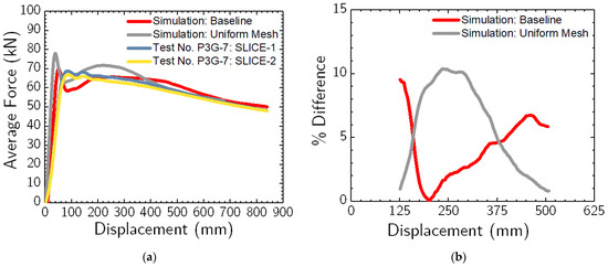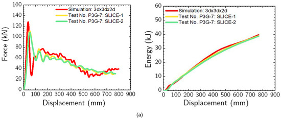 Comparisons of the simulation results with the dynamic impact testing results are shown in Figure 3 and provided in Table 4. The most important results for comparison purposes were an average force at 125 mm, 250 mm, 375 mm, and 500 mm of pile displacement (measured at the impact point). These forces are essential for designing and analyzing soil-embedded barrier systems subjected to vehicular impacts. These forces were obtained by dividing the energy by the respective displacements [48].