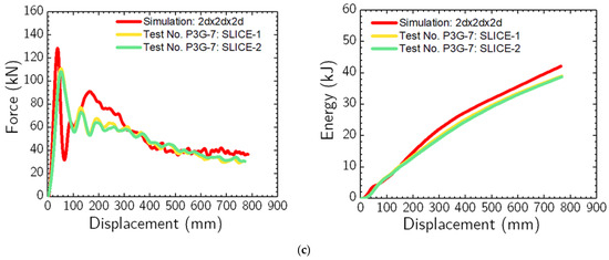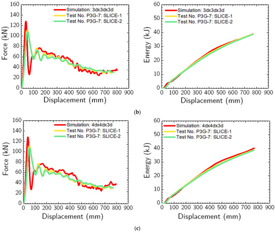 Force vs. displacement and energy vs. displacement comparisons between physical impact test data (i.e., test no. P3G-7) and simulation with (a) 3 d × 3 d × 2 d; (b) 3 d × 3 d × 3 d; and (c) 4 d × 4 d × 3 d soil domain sizes.