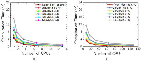 Computation time as a function of number of CPUs for the six soil domain sizes for (a) BNR boundary condition and (b) SPC boundary condition.