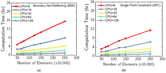 Relationship between computation time and number of soil elements at 8, 16, 32, 64, and 124 CPUs for (a) BNR boundary condition and (b) SPC boundary condition.