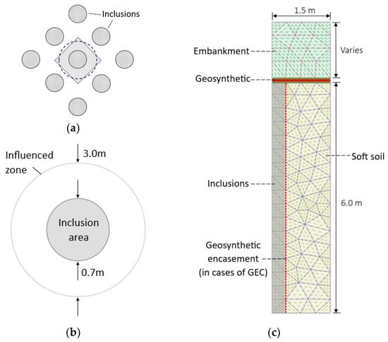FEM simulation of embankments reinforced with vertical inclusions on soft soil: Layout (a); Unit cell (b); FEM mesh (c).