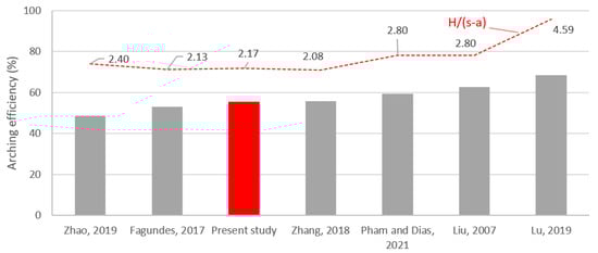 Comparison of arching efficiency between present study and relevant studies including Zhao, 2019 [10], Fagundes, 2017 [7], Zhang, 2018 [8], Pham and Dias, 2021 [11], Liu, 2007 [6], and Lu, 2019 [9].