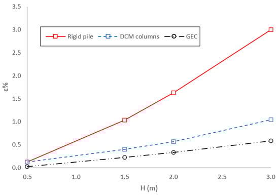 Figure 4 illustrates the computed geosynthetic strains for three types of inclusions at varying embankment heights. As the embankment height increases across the three inclusion types, a greater load is distributed to the subsoils, resulting in larger geosynthetic deflection. Consequently, the geosynthetic bears an increased load transfer to the inclusions, mobilizing a higher tensile force. The geosynthetic strain reaches its peak in the case of rigid piles, followed by DCM columns and GEC, respectively. This observation underscores that, given the same characteristics of geosynthetic reinforcement, the significance of geosynthetics becomes more pronounced in the context of rigid piles.
