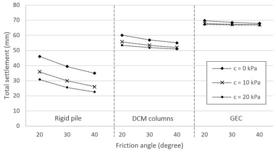 The dependence of total settlement of soft ground on the shear strength of fill soils including cohesion and friction angle under inclusion supports is shown in Figure 6. It is evident to note that the friction angle and cohesion of fill soils can limit the settlement of soft ground. However, the effect of soil shear resistance is different for the three types of inclusions. In fact, the total settlement can be reduced by 35% in the case of rigid pile (friction angle equals 40°) considering the effect of soil cohesion. Meanwhile, using fill soil with an internal friction angle of 20 degrees, DCM columns, and GEC could limit by 11% and 4%, respectively, the amount of total settlement. A similar tendency can be noted for the influence of soil friction; as it increased from 20° to 40°, the decreases of total settlement under supports of the rigid pile, DCM columns, and GEC were 27%, 8%, and 3%, respectively. Thus, the effect of the shear strength of fill soil on rigid piles is greatest in the considered cases of reinforced inclusions.