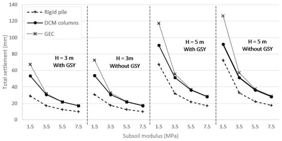 Figure 7 demonstrates the influence of subsoil modulus on the total settlement of soft ground reinforced by inclusions. The total settlements increase with the decrease in the subsoil modulus. However, the increase in settlement of rigid piles is smaller than in the other two cases and it is more significant in the cases of high embankment (H = 5 m). The benefits of geosynthetics in reducing the total settlement are also considered under different heights (3 and 5 m) of embankment. The use of geosynthetic reinforcement on the pile’s head seems not to provide enough benefit for solutions of DCM columns in both considered embankment heights. Nevertheless, geosynthetic reinforcement allows reducing the settlement in the cases of rigid piles and GEC supporting a 5 m height embankment. Indeed, the settlement can be reduced by 7% and 8% if geosynthetic reinforcement is used to support rigid piles and GEC, respectively, over the weakest soft ground.