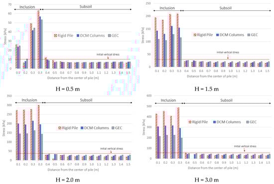 The stress distribution acting over the surface of soft ground reinforced by inclusions is presented in Figure 8. The stresses are computed for four embankment heights (0.5, 1.0, 2.0, and 3.0 m) in three cases of inclusion types. Note that the increase in stresses is obtained at the inclusion areas to confirm the load distribution occurred due to the act of inclusion. Nevertheless, the load transfer mechanism seems to be different due to the embankment height between inclusion solutions. In the case of the low embankment (0.5 m), the distributed load at the inclusion area is not very different between solutions, and it seems to be concentrated at the edge of the inclusions. Meanwhile, the significant differences can be seen for high embankments (from 1.0 m to 3.0 m). The stress distribution on the rigid pile head is significantly larger than the other solutions. Furthermore, the load has a uniform distribution on the inclusion surface. Comparing DCM columns and GEC, although the inclusion modulus is assumed to be the same, DCM columns show more effectiveness than the GEC solution in concentrating stress.