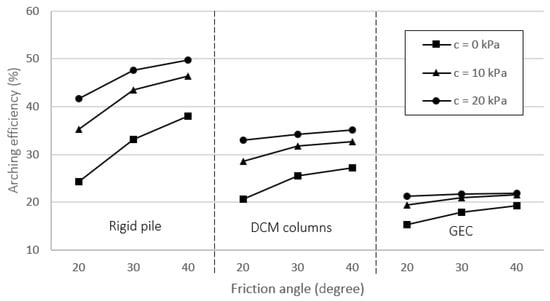 Equation (1) indicates that the efficiency of the arching effect varies between 0 and 100%, representing the absence of soil arching to its complete realization. Figure 9 demonstrates the influences of embankment fill strengthening (cohesion and internal friction) on the arching efficiency for cases where the embankment block is 3 m high. Obviously, using a high shear resistance of embankment fill enhances the arching effect occurring in the three inclusion solutions. In fact, an increase in both friction angle and cohesion of filling soil allows an increase in arching efficiency. However, the arching effect between inclusion solutions is different and this explains the results of settlement reduction, which are presented in Figure 6. First, the calculated arching efficiency of the rigid pile ranges from 25 to 50%, while it is from 21 to 35% and from 15 to 22% for DCM columns and GEC, respectively. Second, the maximum increase can be noted in the case of a rigid pile under the effect of soil cohesion. In fact, the arching efficiency increases by 70% if the cohesion of the filling material increases from 0 to 20 kPa with its friction angle equal to 20°. For the similarly considered embankment fill, the increments obtained for DCM columns and GEC are 60% and 39%, respectively.