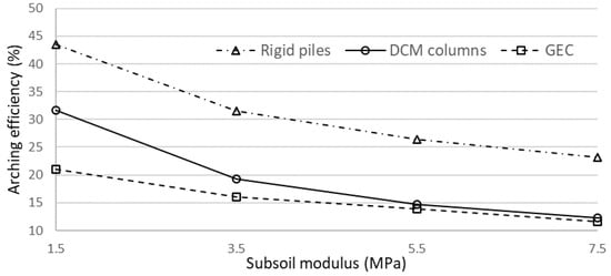 As presented in Figure 10, arching efficiency reduces with increasing the subsoil modulus. The stiffness differences between inclusion and soft ground cause the stress distribution. As the soft ground modulus increases, the difference in stiffness between inclusion and soft soil reduces. This explains the decreasing tendency obtained for three inclusion solutions in Figure 10. Note the responses are different between inclusions. When the subsoil modulus increases from 1.5 MPa to 7.5 MPa, the estimated reductions in arching efficiencies are 62% for the case of DCM columns and approximately 45% for both cases of rigid pile and GEC. Based on these results, it can be noted that the influence of subsoil modulus is significant on the arching phenomenon occurring above inclusions.