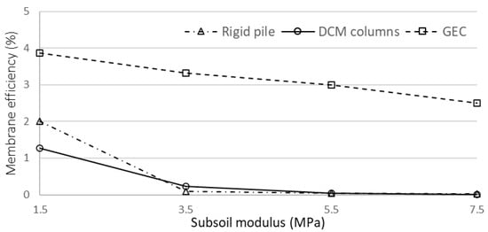 The dependency of the membrane effect on subsoil modulus is presented in Figure 12 as the decreased tendencies can be noted. As the subsoil modulus increases, the variation between the stiffness of inclusions and soft soil is reduced. Consequently, more stresses remain on the soft ground. This can explain why the geosynthetic acts less to transfer loads onto the inclusions due to the membrane effect. Moreover, the numerical results show that the effect of geosynthetic reinforcement is insignificant in the considered cases, as the calculated membrane efficiencies are less than 4%. In the cases of GEC, the effectiveness of geosynthetics is evident in the considered soft soils. However, for the other two solutions, the impact of geosynthetics becomes almost negligible as the modulus of the soft soil increases.