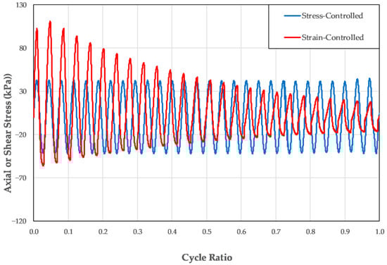 Stresses in a stress-controlled and a strain-controlled cyclic triaxial or cyclic direct simple shear test.