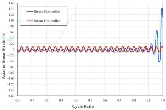 Figure 2, the maximum amplitude of the applied strain remains constant throughout a strain-controlled cyclic triaxial test or a strain-controlled cyclic direct simple shear test. Because of this, the amount of energy dissipated and excess pore pressure generated are controlled by the resistance to deformation produced by the soil (i.e., the axial or shear stress). As the cyclic loading generates excess pore pressures, both the effective stress and its strength decrease. Because of the strength loss, a decreasing amount of resistance is required to maintain the maximum level of straining as it continues to be applied at a constant level. As a result, during the early part of the test a relatively large amount of energy is dissipated because the soil has the strength required to resist the applied displacements. Later in the test, when the strength is lower, smaller amounts of energy are dissipated in the soil in response to the applied deformations.