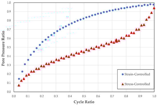 Pore pressure generation patterns as a function of cycle ratio for stress- and strain-controlled cyclic triaxial tests.