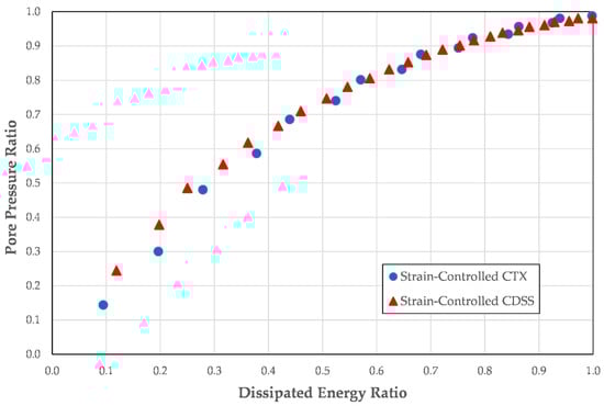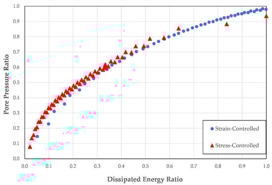 Pore pressure generation patterns as a function of dissipated energy ratio for stress- and strain-controlled cyclic triaxial tests.