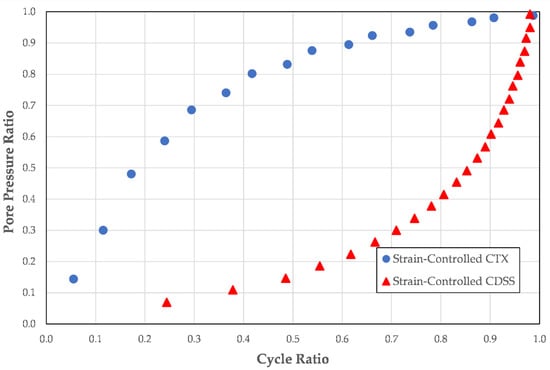 Pore pressure generation patterns as a function of cycle ratio for one strain-controlled cyclic triaxial test and one strain-controlled cyclic direct simple shear test.