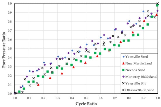 Pore pressure ratio plotted against the cycle ratio for the six soils tested.