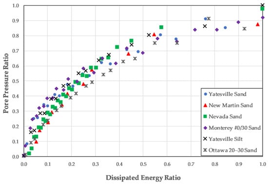 Pore pressure ratio plotted against the dissipated energy ratio for the six soils tested.