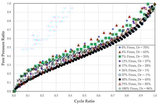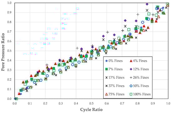 Pore pressure ratio plotted against the cycle ratio for the specimens with 10 different non-plastic fines contents prepared to approximately 26% relative density.