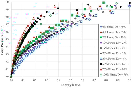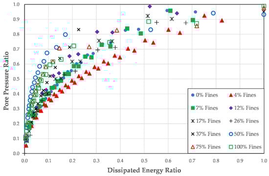 Pore pressure ratio plotted against dissipated energy ratio for specimens with 10 different non-plastic fines contents prepared to approximately 26% relative density.