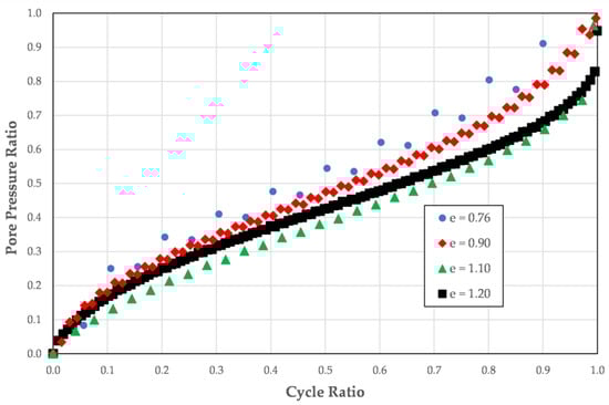 Pore pressure ratio plotted against cycle ratio for soils over a range of relative densities.