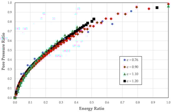 Pore pressure ratio plotted against the dissipated energy ratio for soils over a range of relative densities.