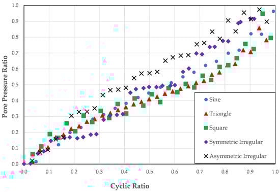 Pore pressure ratio plotted against the cycle ratio for the different load shapes.