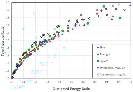 Pore pressure ratio plotted against the dissipated energy ratio for the different load shapes.