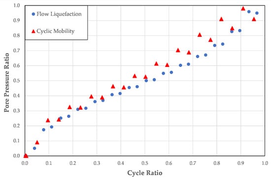 Pore pressure ratio plotted against the cycle ratio for the specimens with flow liquefaction and cyclic mobility failure modes.