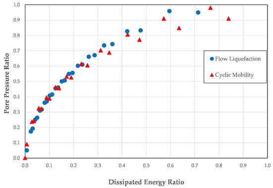 Pore pressure ratio plotted against dissipated energy ratio for the specimens with flow liquefaction and cyclic mobility failure modes.