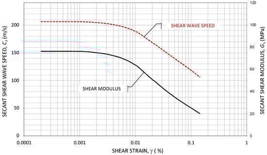 Both the shear wave speed and the secant shear modulus are strain-dependent. At 0.0002% shear strain, the shear wave speed is 206 m/s and the maximum shear modulus is 76 MPa. When exceeding about 0.01% shear strain, the shear wave speed and the shear modulus start to decrease markedly. At 0.1%, a strain level at which conventional laboratory measurements obtain the first data point, the secant shear modulus (24 MPa) is only 32% of its maximum value (76 MPa).