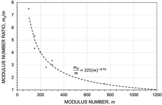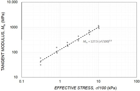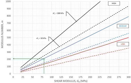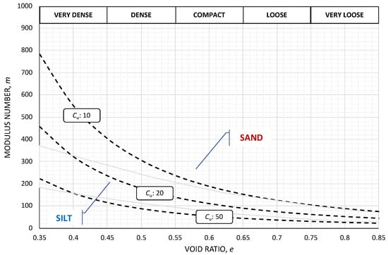 Substituting Equation (26) into Equation (27), a relationship for normally consolidated sandy soils between the modulus number,