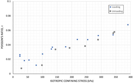 v0 = initial Poisson’s ratio, which is set at 0.1. According to this relationship, Poisson’s ratio varies between 0.1 and 0.5. However, based on the above-reported test results for granular soils and drained conditions, the value of
