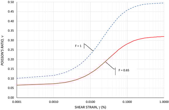 Figure 10. The variation in Poisson’s ratio as a function of shear strain according to Equation (24) is shown in
