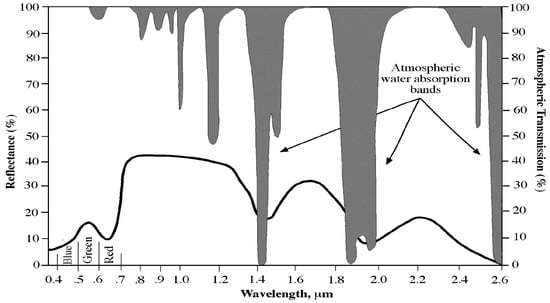 The vibration of O–H bonds in water molecules causes strong absorption features around 1400 and 1900 nm (grey shading) due to atmospheric absorption. These strong bands are often avoided in remote sensing sensors and data products [13]. The black line curve indicates a typical soil spectrum. Figure from Mohamed, Saleh [31].
