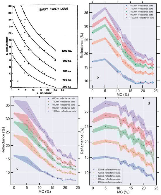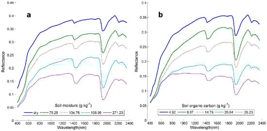 Understanding the relationship between soil reflectance and MC is also valuable for addressing the problem of correcting soil reflectance data for the effects of soil moisture when other soil variables such as soil carbon are the primary interest [21,23,33,41]. Correction of soil spectra for the effects of soil moisture is particularly important in the case of SOC prediction, as soil moisture and soil carbon generate similar spectral features [42] and have a similar influence on soil reflectance (Figure 2a,b). Therefore, the accuracy of SOC prediction algorithms based on remotely sensed, or visible–NIR soil reflectance data should be greatly improved following correction for the spectral effects of soil moisture.