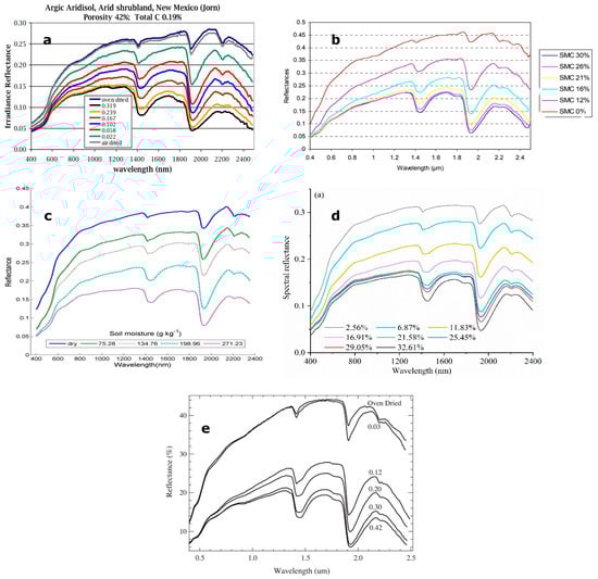 Moist soil reflectance curves (a) Philpot [53], (b) Fabre, Briottet [32], (c) Jiang, Chen [33], (d) Yu, Hong [23] and (e) Whiting, Li [40] are typically convex in shape, with absorption features apparent around 1400, 1900 and 2100 nm.