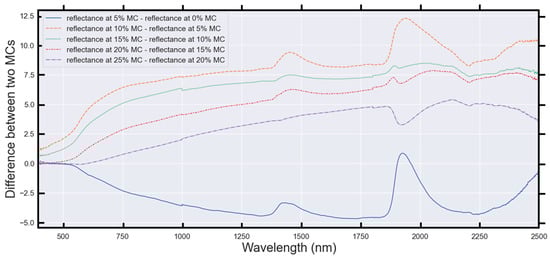 Figure 8 demonstrates a monotonic decrease in soil reflectance for a single soil sample at all wavelengths from 600–2500 nm between 5 and 25% MC. This result is consistent with Figure 6 and Figure 7 but is now shown for an individual soil sample (rather than the average of ten soil samples). The change in soil reflectance between 0 and 5% MC in Figure 8 can be positive or negative as discussed in Section 5.2 below.