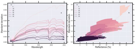 To quantify the uncertainty in spectral data, soil reflectance measurements were repeated five times for each soil sample at each MC (Figure A2). The standard deviation of the reflectance typically increases with wavelength (Figure 9a) to approximately 1800 nm, before plateauing and then decreasing slightly between 2300 and 2500 nm. The standard deviation also increases as a function of absolute reflectance (Figure 9b). As soil reflectance is a function of soil biological, physical and chemical properties [62], increased heterogeneity in soil properties at a low MC is a likely explanation for these phenomena, as opposed to faults with the measurement instrument, calibration method or sample preparation procedure. For example, finer-grained soils such as clay have a lower surface roughness than sand or gravelly soils, and therefore higher reflectance [63]. Darker soil components such as organic matter and moisture also decrease soil reflectance [52,64]. Variability in soil surface characteristics and consequently soil reflectance is an intrinsic property of soil [47], so collecting multiple measurements for each sample and analysing the averaged result will increase the robustness of soil reflectance measurements.