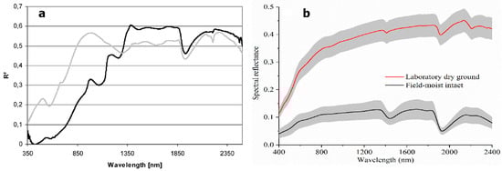 The absorption, usually equal to 1 minus the reflectance (R), caused by soil moisture also varies with the wavelength [28,56]. All studies compared here (Figure 2, Figure 3, Figure 4 and Figure 5) record higher absorption in the near-infrared (NIR), compared to visible wavelengths. There are, however, differences in the magnitude of the absorption between samples (compare the y-axes in Figure 2, Figure 3, Figure 4 and Figure 5).