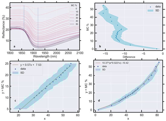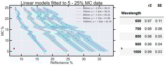 (a) The average reflectance (400–2500 nm) of all samples (blue dots) and average standard deviation (SD) (blue shading) of five reflectance measurements are shown. (b) The data are limited to the range of 5–25% MC to demonstrate a linear model fit for this domain.