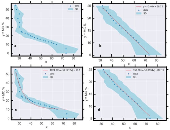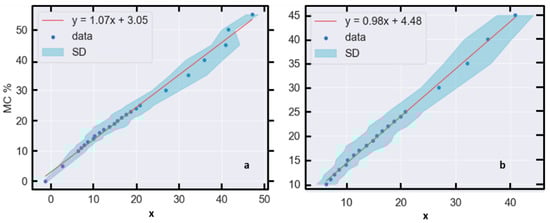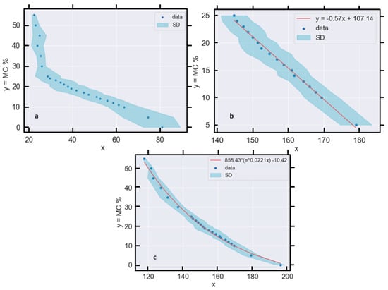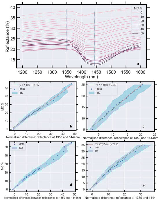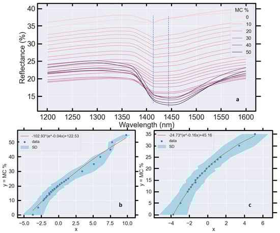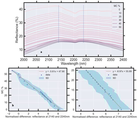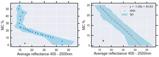 where y represents MC % and x is the sample—and wavelength—averaged reflectance. Within this domain, a linear relationship with a negative slope is apparent (Figure 13a) and soil reflectance decreases monotonically as MC increases. Beyond 25% MC, the relationship saturates.