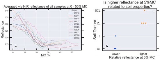 - Soil reflectance decreases with increasing MC [30,34,40];