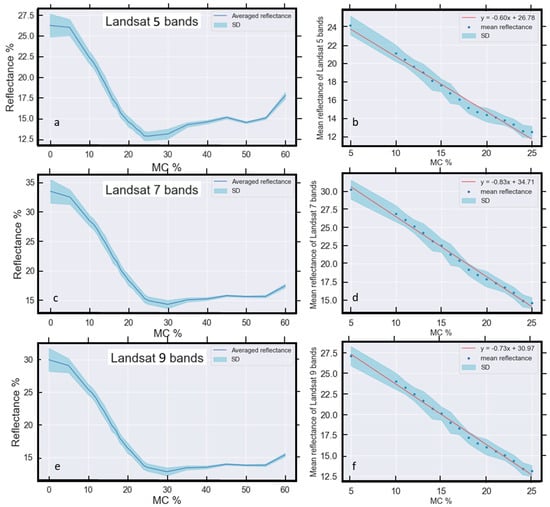When soil reflectance data from the Muttama samples are averaged over the (a,b) Landsat-5, (c,d) Landsat-7 and (e,f) Landsat-9 bands, a strong linear relationship is apparent for the domain of 5–25% MC in all cases [65].