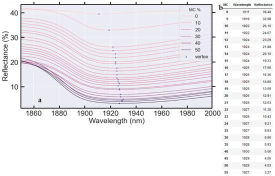 The position of these absorption features is inconsistently reported in the literature, however, with reports of these features centred at 1400 nm [57], 1444 nm [54], 1450 nm [58], 1470 nm [16], 1900 nm [54], 1920 nm [13], 1930 nm [58] and 1944 nm [55]. The high-resolution data presented here allows close inspection of the position of these features (Figure 6b,c). Figure 6 shows the features to be consistently centred at neither 1900 nm nor 1444 nm. Instead, there is a gradual drift in the vertex of the absorption features towards higher wavelengths as soil MC increases (Figure 7). This result is important not only for the interpretation and reporting of relationships between soil MC and reflectance but is also highly significant for the choice of wavelengths utilised for soil MC prediction from soil spectral data. This demonstration of evolution in the wavelength of the absorption feature with MC also shows that data from a range of wavelengths (such as the average value of a multispectral imaging band) is better suited to the monitoring of absorption feature depth rather than using data from a single fixed wavelength.