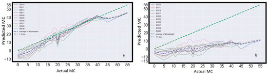 It is emphasised that each sample (Figure 13a) demonstrated a similar pattern to the averaged result in Figure 14a. This provides a strong argument that a linear relationship between reflectance and soil MC can be assumed for an arbitrary soil sample or a group of soil samples. It remains possible that exceptions exist.