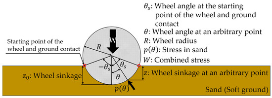 where p(θ) is the stress in the sand under the wheel, kc is the coefficient governed by the adhesive force of the sand, kφ is the coefficient governed by the internal friction angle in the sand, B is the wheel width, R is the wheel radius, n is the sinking index, θ is the wheel angle at an arbitrary point, and θs is the wheel angle at the starting point of the wheel and ground contact [28].