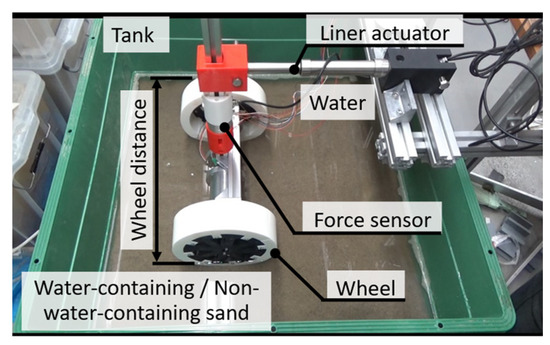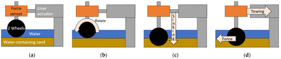 The procedure in the experiment used to confirm the effect of water on the wheel anchoring capacity acting on the ground is shown in Figure 4. As shown in Figure 4a, the test apparatus consists of two wheels in contact with the ground, a force sensor to measure the forces acting on the ground and the wheels, a linear actuator to tow the wheels, and water-containing sand with a mixture of water and sand.
