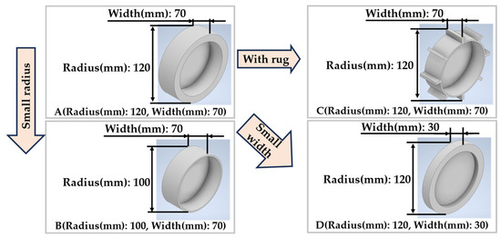 The experimental machine (Figure 5) consists of two wheels, a force sensor, a linear actuator, and water-containing/non-water-containing sand placed in a plastic tank. Additionally, the wheel distance indicates the distance between both wheels. The wheels used in the experiment are all made of PLA. Their shapes are shown in Figure 6. Wheel A is the base wheel; wheel B has a smaller radius than wheel A; wheel C has the same radius and width as wheel A, albeit with the addition of lugs; and wheel D has a smaller wheel width than wheel A. Table 1 summarizes the specifications of the experimental machine.